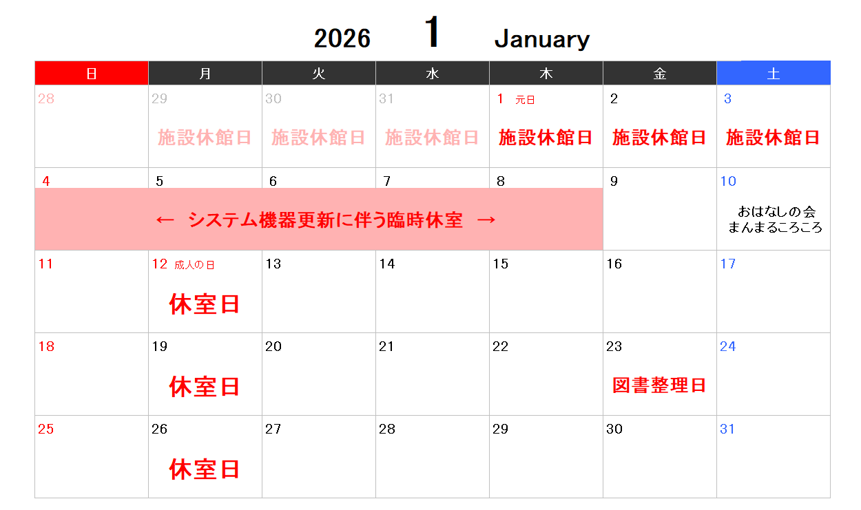 火曜日~日曜日 9:00~17:00(閲覧時間・貸出時間とも) 午後5時以降は返却ボックスへの返却が出来ます。(午後9時まで) |